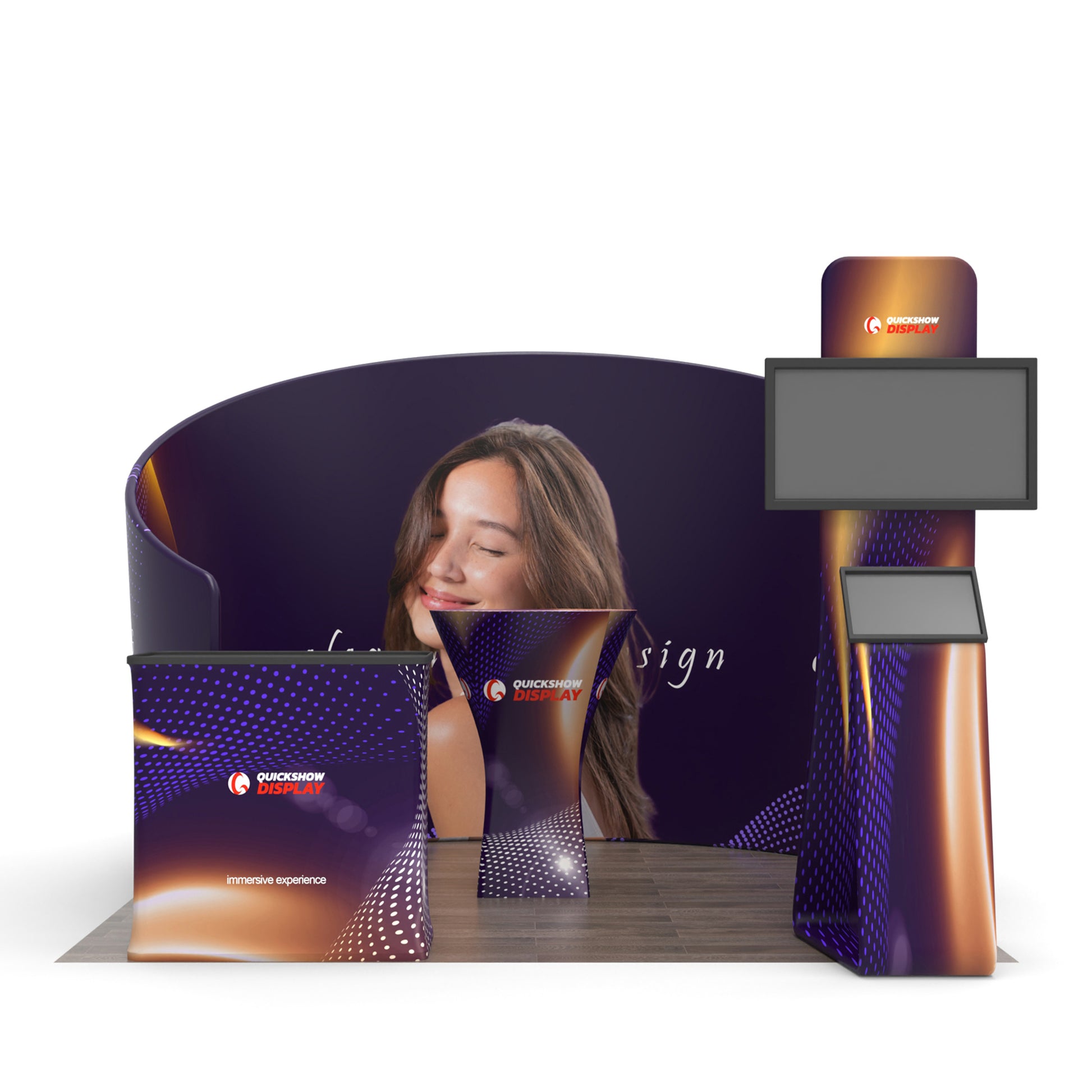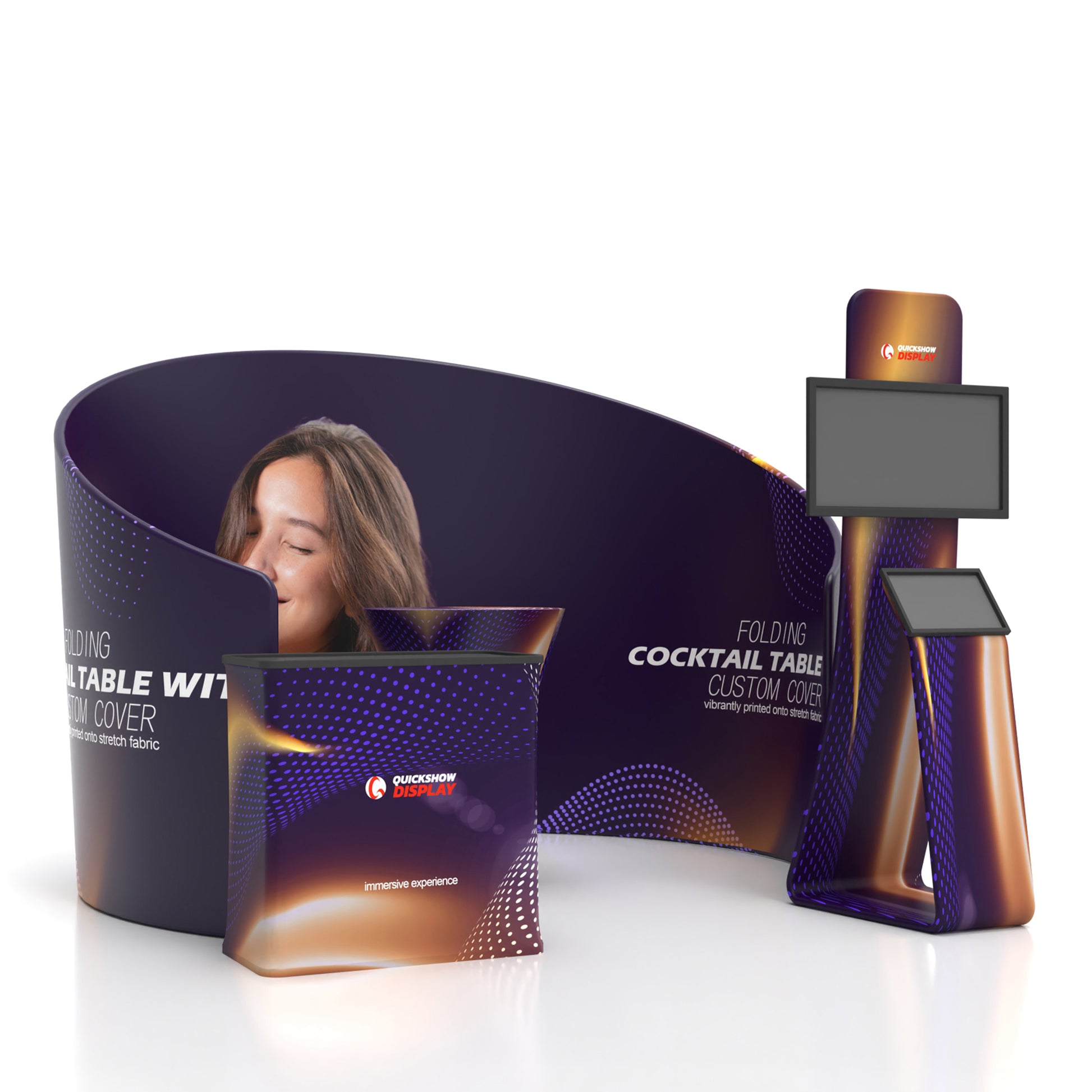 Immerse your audience in an unforgettable brand experience with our premium 10ft Semi-Circle Exhibit Package. This comprehensive solution combines elegant design with practical functionality, featuring our signature semi-circle display stand with effortless snap-together aluminum framework and premium stretch fabric graphics, a sophisticated round cocktail display counter perfect for product displays and client interactions, and a versatile monitor & literature banner stand that seamlessly integrates digital and printed marketing materials. Enhanced with the optional heavy-duty wheeled transport case for maximum portability and protection, this complete package transforms any event space into a professional engagement zone ideal for trade shows, product launches, and corporate promotions. Designed for quick setup and lasting impact, our all-in-one exhibit solution helps you create meaningful connections and stand out from the competition—elevate your next event today.