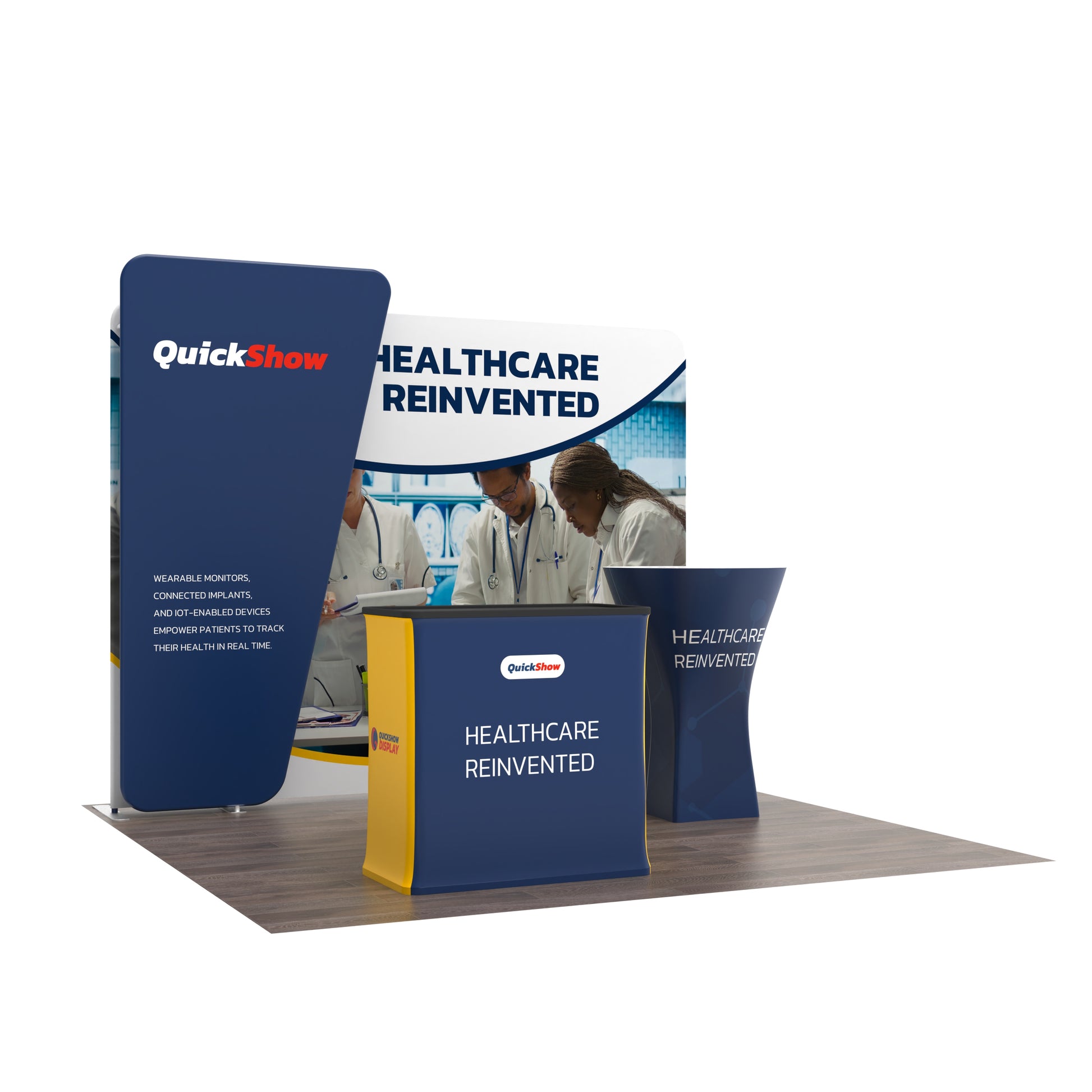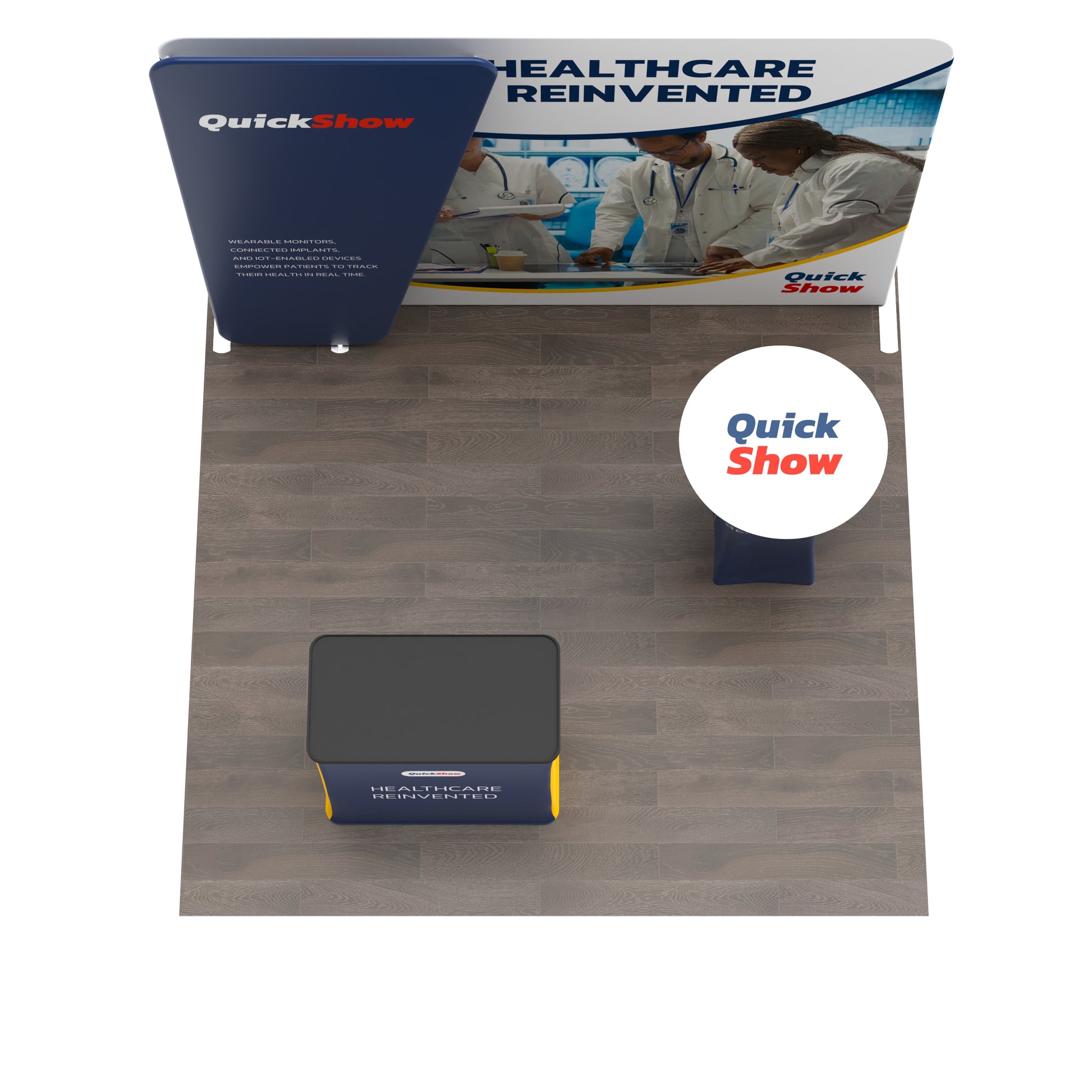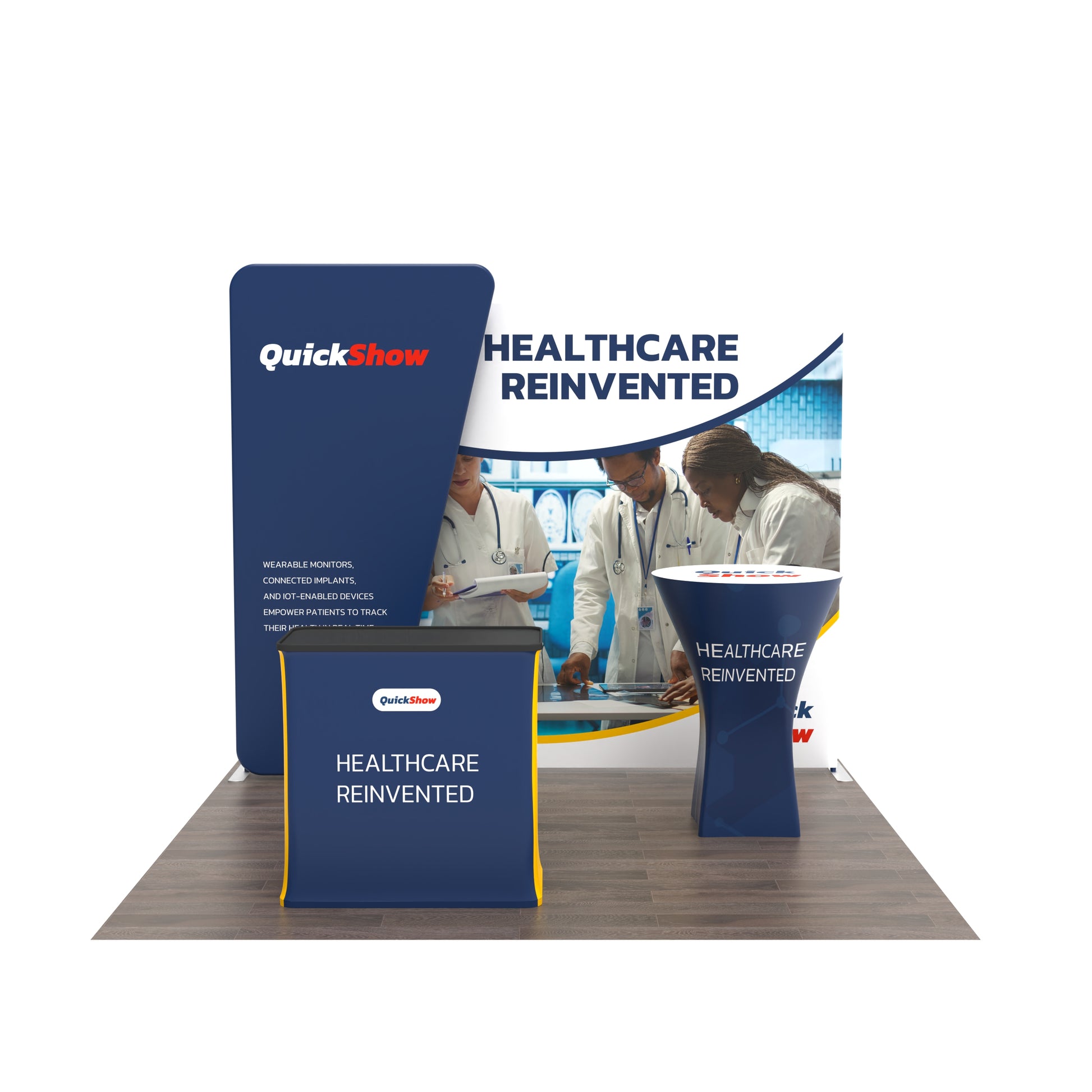 Create a show-stopping brand experience with this complete, professionally curated display solution that combines striking visual impact with effortless setup. The centerpiece is our Overlap Shape Wall, a modern tension fabric display featuring an eye-catching overlapping design and smooth curved profile that instantly upgrades any space, a great alternative to standard backwall displays, with lightweight aluminum tubes that snap together in minutes and a wrinkle-free fabric graphic that zips closed for seamless branding. Paired with a elegant custom-printed Cocktail Table, this kit delivers both style and function, offering a high-impact branding surface that folds flat for easy transport while providing an elegant space for product displays or guest interactions. For added versatility, the optional Hard Case to Podium serves dual duty as rugged wheeled transport for your entire kit and transforms into a professional branded podium in seconds. Every component is designed to work together, from the visually immersive backdrop to the portable yet polished furnishings, ensuring a cohesive and memorable brand experience. This all-in-one exhibition kit is the smart choice for professionals who demand premium impact.
