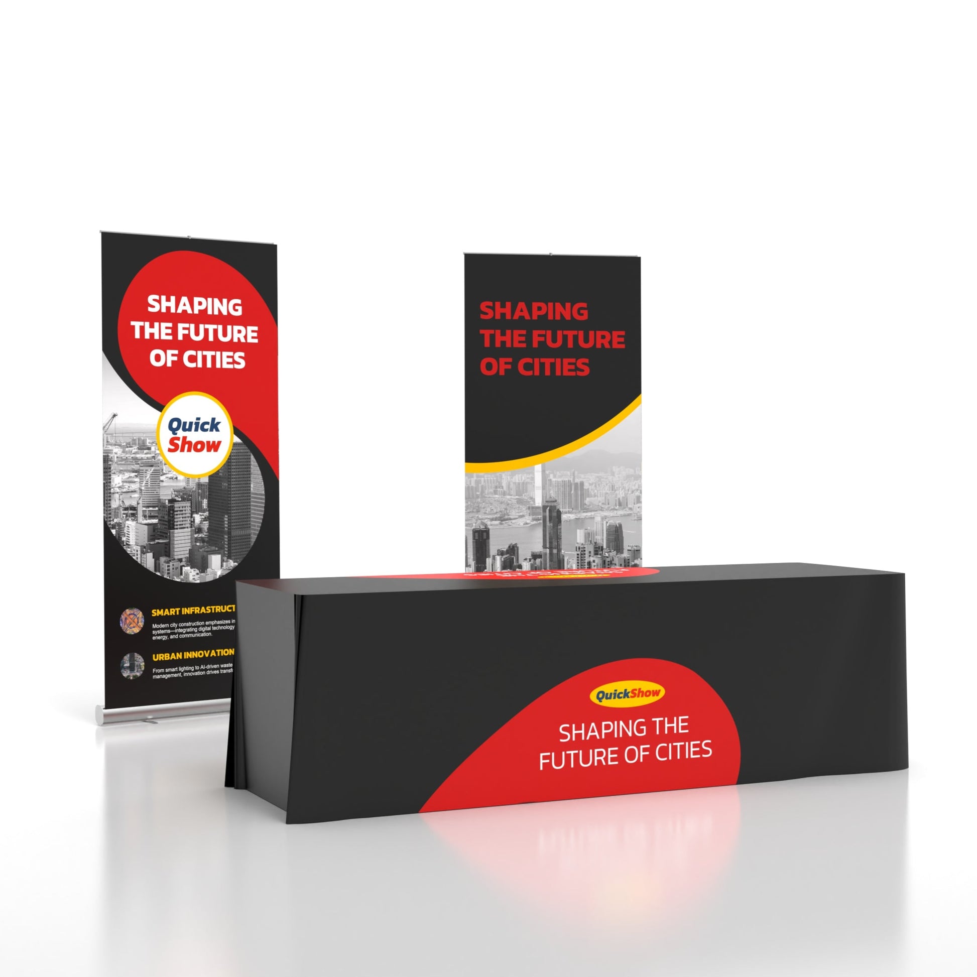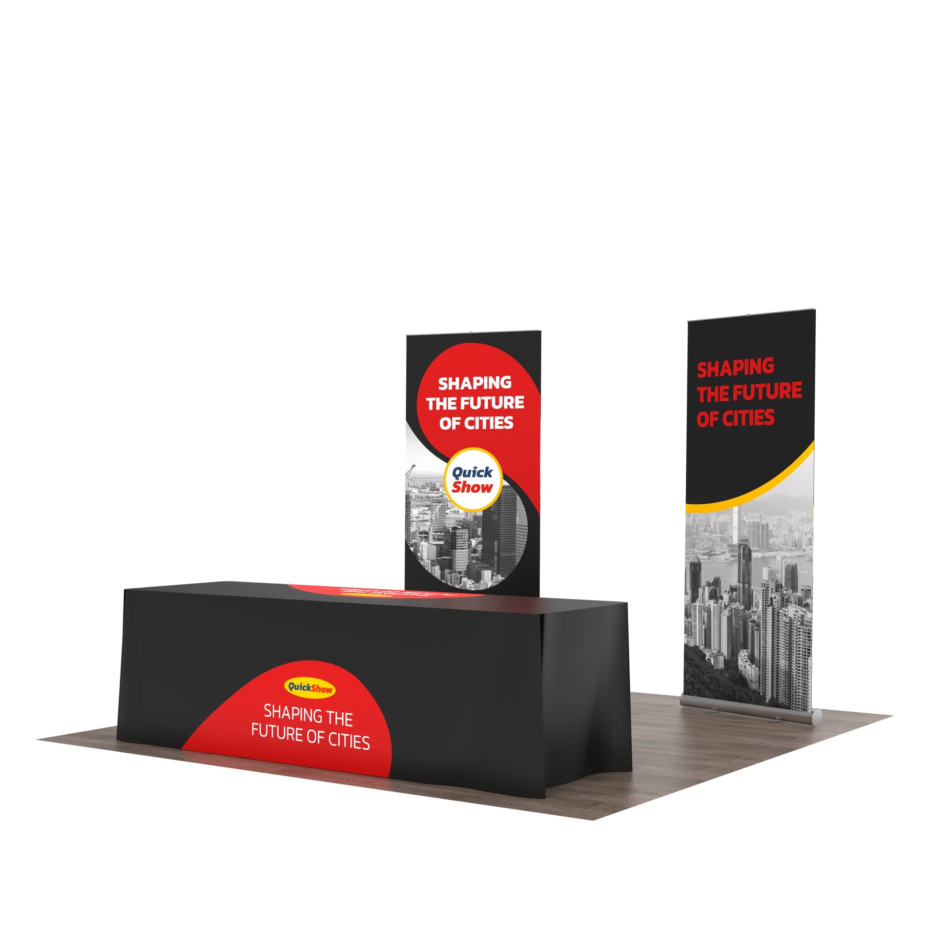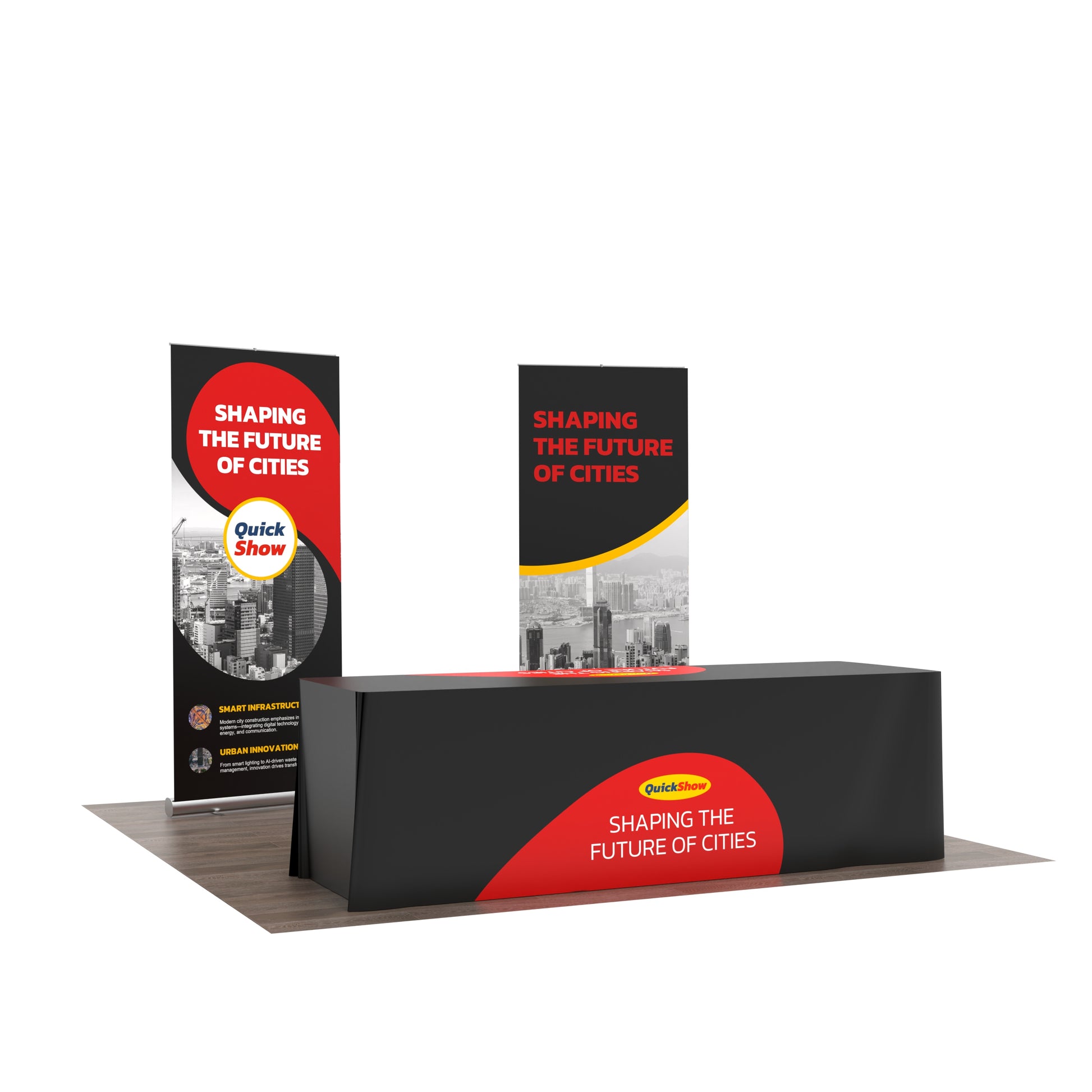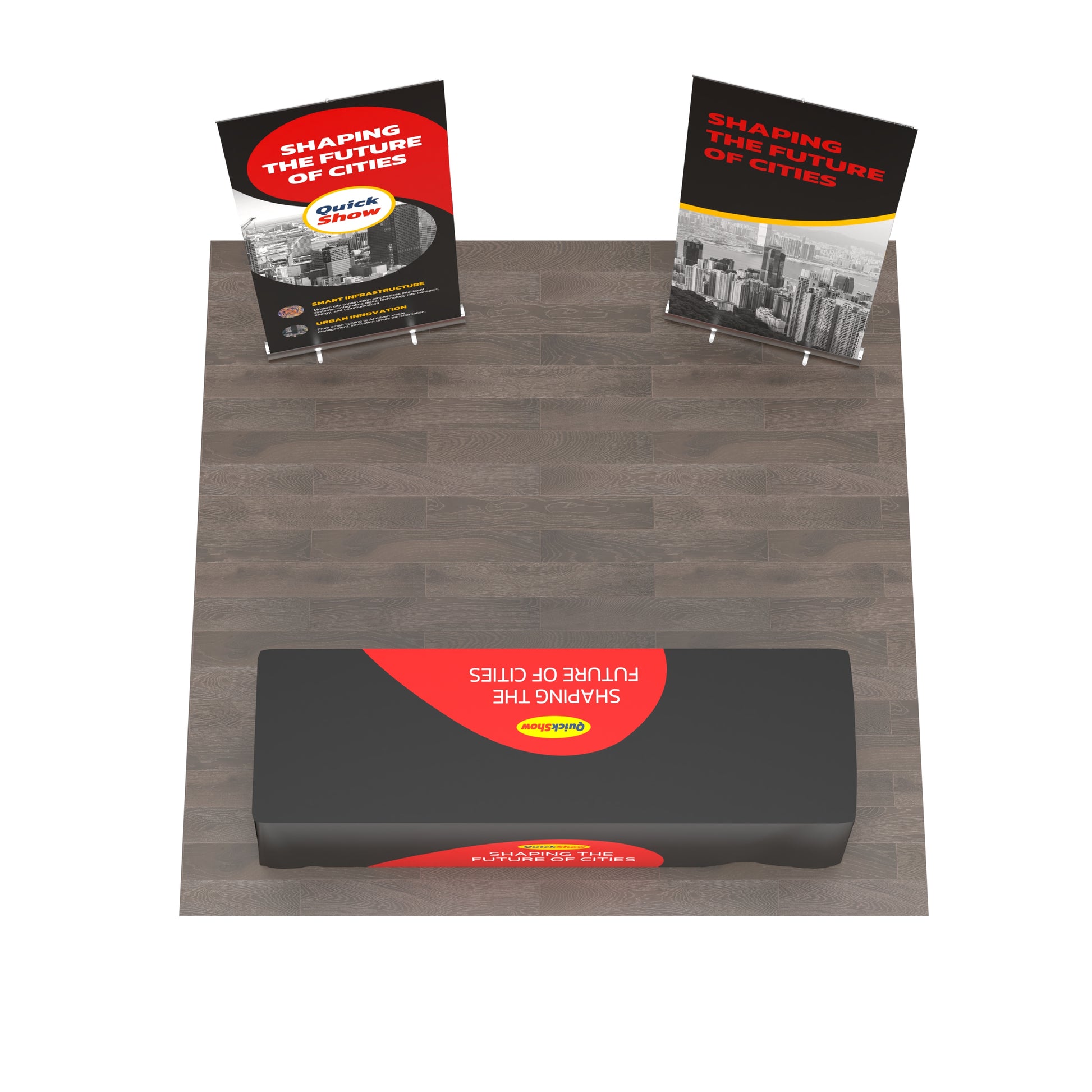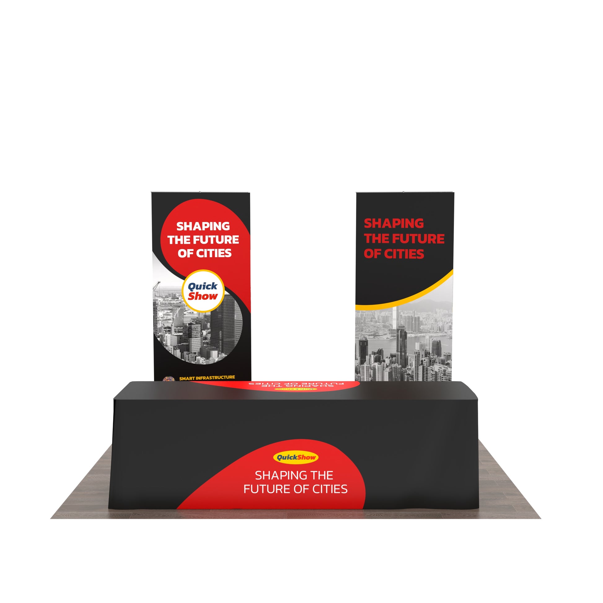 Transform any space into an impressive branded display with our considered trade show kit, designed for professional results with effortless setup. This comprehensive package features two premium 2.8ft with heavy-duty aluminum bases that pop up in seconds and lie flat for transport in included protective cases. Paired with an elegant polyester table throw that drapes perfectly to conceal storage beneath, this kit provides everything needed for a polished exhibition presence. The thoughtfully curated components work together to create visual impact while maintaining portability. It's the smart solution for anyone needing reliable, reusable exhibition tools that make a strong impression wherever business takes you.