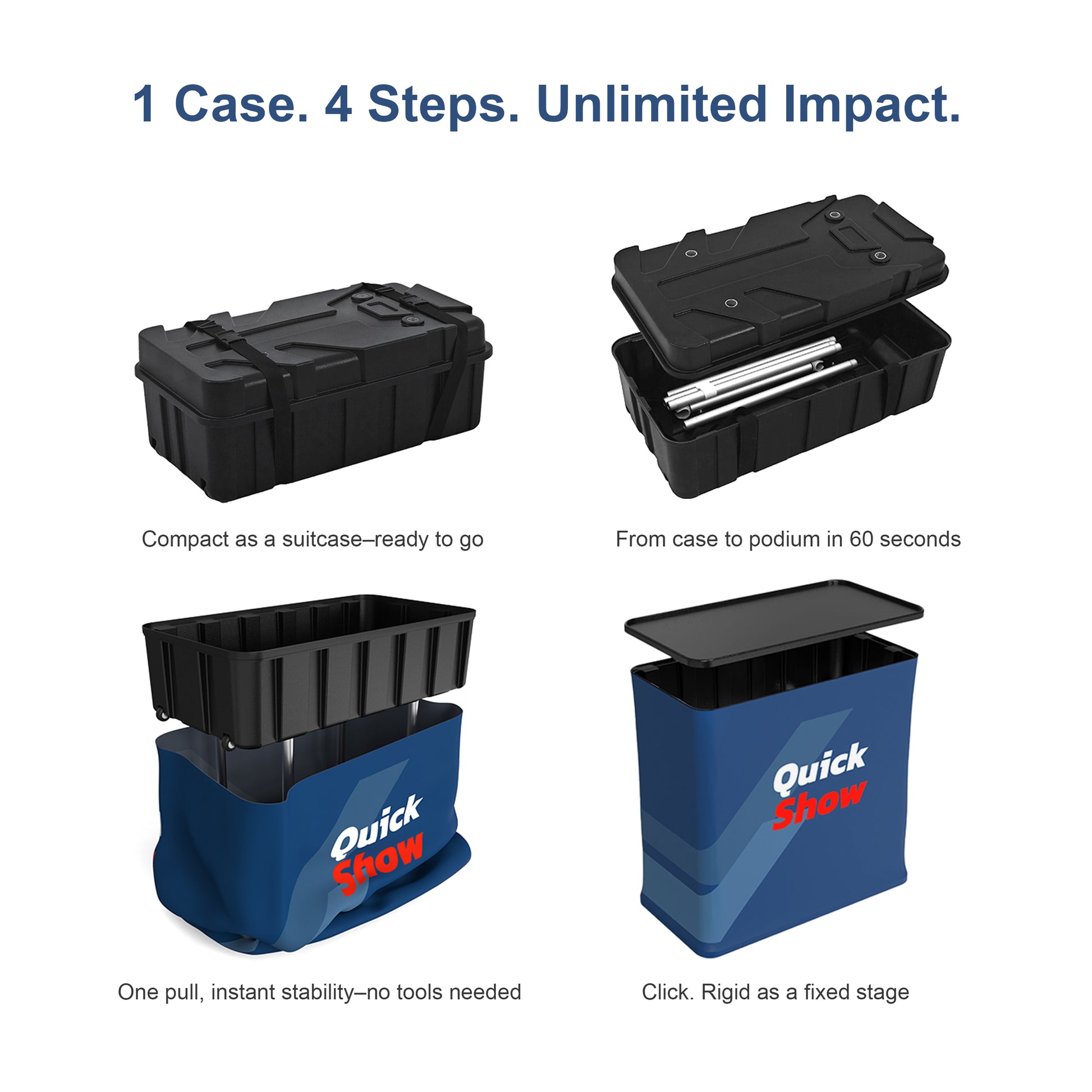 The ultimate dual-purpose solution for trade shows and events: the Hard Case to Podium with Custom Printed Graphic combines a rugged, wheeled hard case for effortless transport with a high-resolution printed fabric podium for impactful brand display. Designed to streamline setup and maximize portability, this convertible case transforms into a professional podium in minutes, featuring a custom graphic panel that showcases your brand logo, messaging, or product visuals. Ideal for exhibitors who demand versatility, durability, and eye-catching design without compromising on convenience.