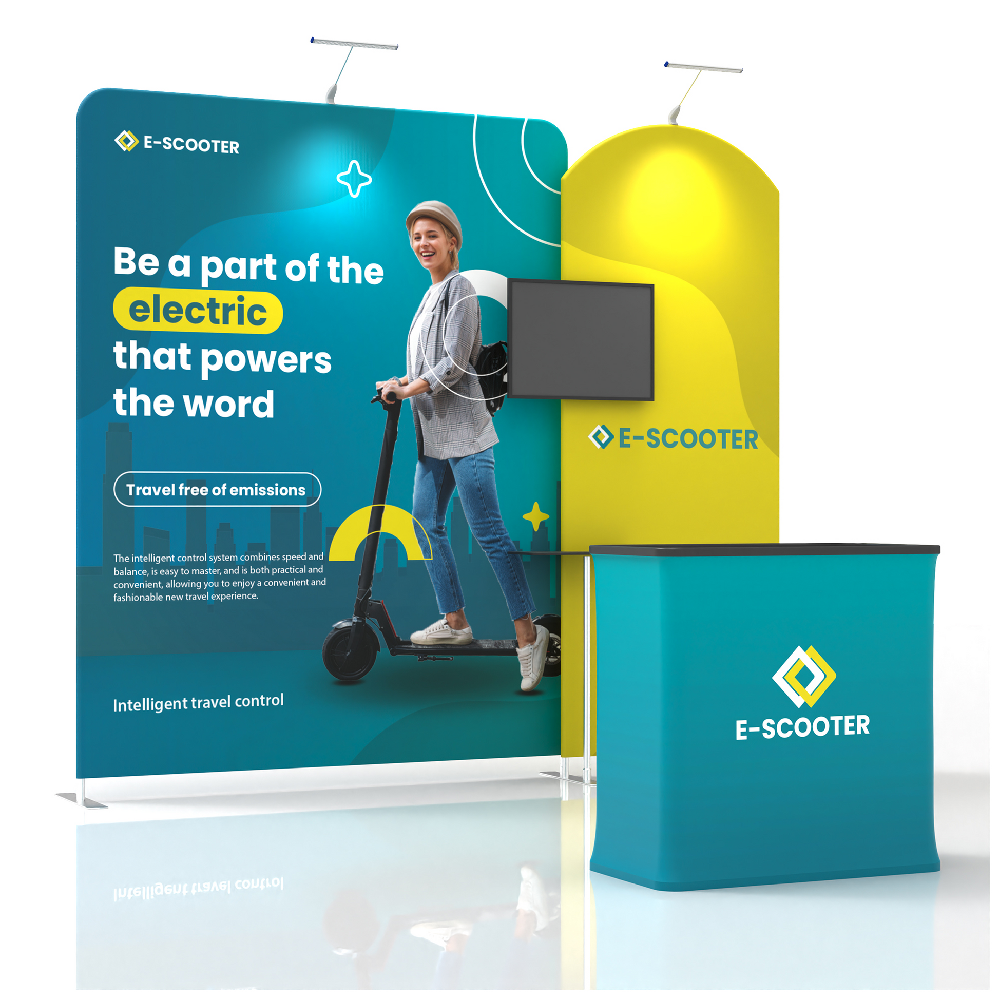 For brands seeking a balance of modern edge and classic professionalism, the TenseFlex Media Display Kit D delivers a 10x10 booth solution featuring a 39'' angled-top backdrop and a 79'' straight-top backdrop, paired with a modular podium, shelving, and TV mount. This unique combination of geometric shapes creates a dynamic visual hierarchy—ideal for showcasing brand stories, product videos, and physical merchandise in one cohesive space. Lightweight, tool-free to assemble, and fully customizable, it’s perfect for exhibitors who want to stand out while maintaining a polished, professional look.